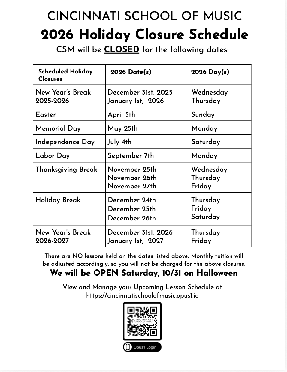 Welcome to the Cincinnati School of Music team! We’re so glad to have you join our community of passionate and dedicated music educators. This page is designed to help you get started, stay organized, and feel confident in your teaching experience at CSM. Please read through each section carefully so you can make the most of your time with us.